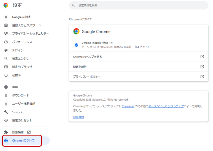 2:画面左の「chromeについて」を選択すると、自動的にUpdateが始まる